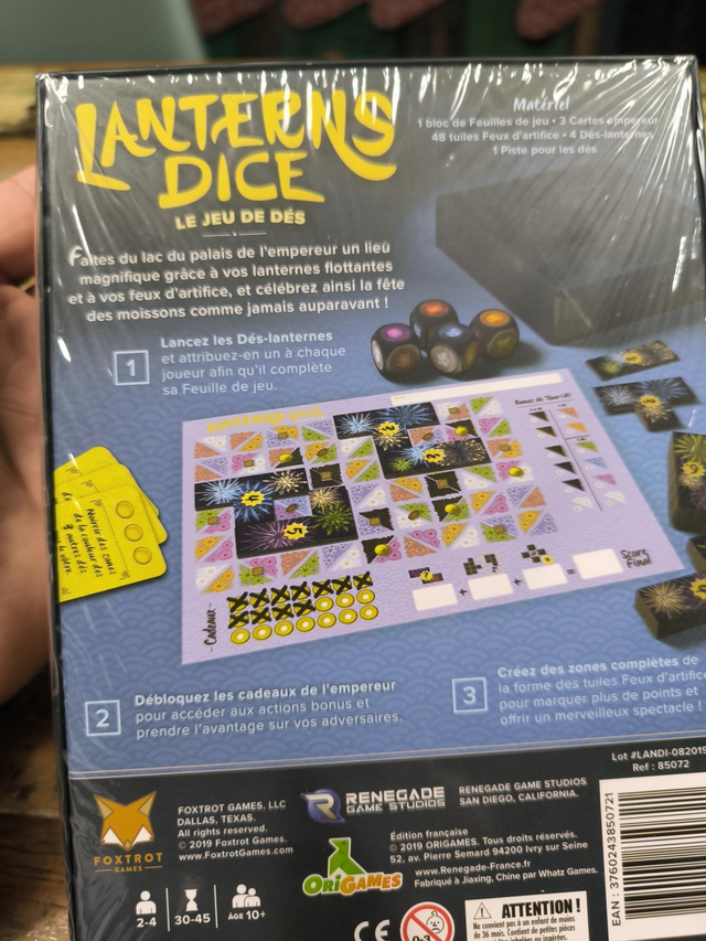 Lancez les dés-lanternes et attribuez-en un à chaque joueur afin que chacun complète sa feuille de jeu. Choisirez-vous de cocher les Pavillons pour obtenir des cadeaux de l’empereur et réaliser des actions bonus? Ou les Pontons et augmenter vos zones entièrement crayonnées pour y poser les tuiles Feux d’artifice en vu de marquer des points de victoire ? À moins que vous envisagiez d’entourer les Bateaux pour plus de points en fin de partie ?